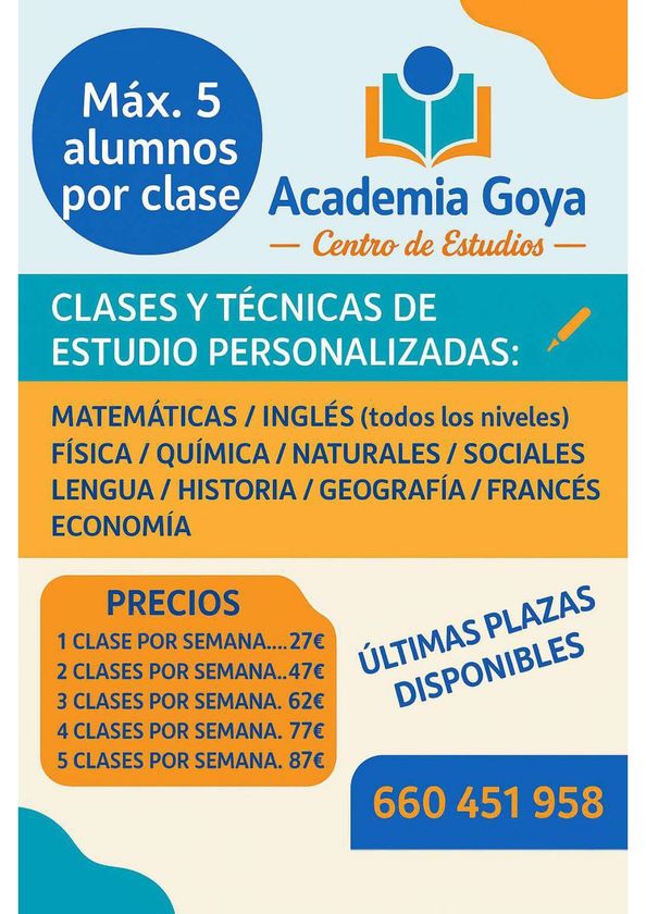 En Academia Goya, ofrecemos un refuerzo escolar adaptado a las necesidades de cada estudiante, ayudándoles a superar desafíos en matemáticas, inglés, lenguas y física, y a alcanzar su máximo potencial académico en primaria y ESO.